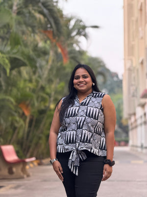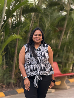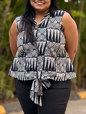 Crafted in striking monochrome block prints, this sleeveless button-down top features a crisp collar and tie-front hem — blending structure with everyday playfulness.