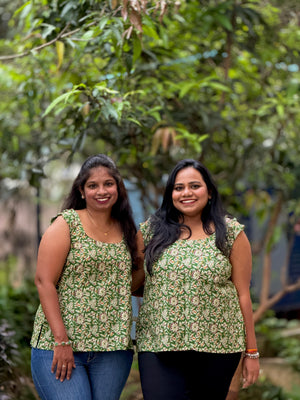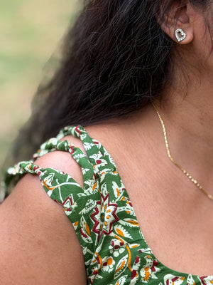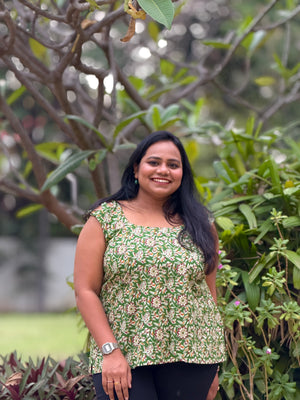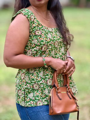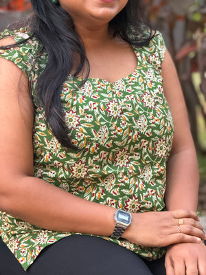 Crafted in breathable cotton with soothing floral prints, this green sleeveless top stands out with ruched shoulder accents and a gentle flare that flatters every silhouette.