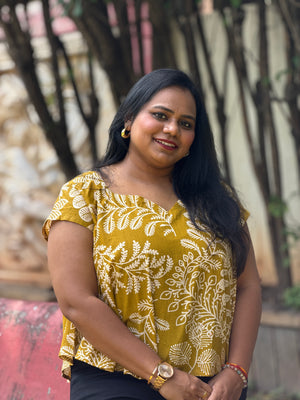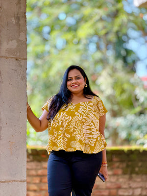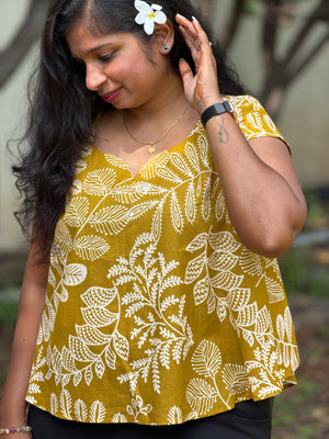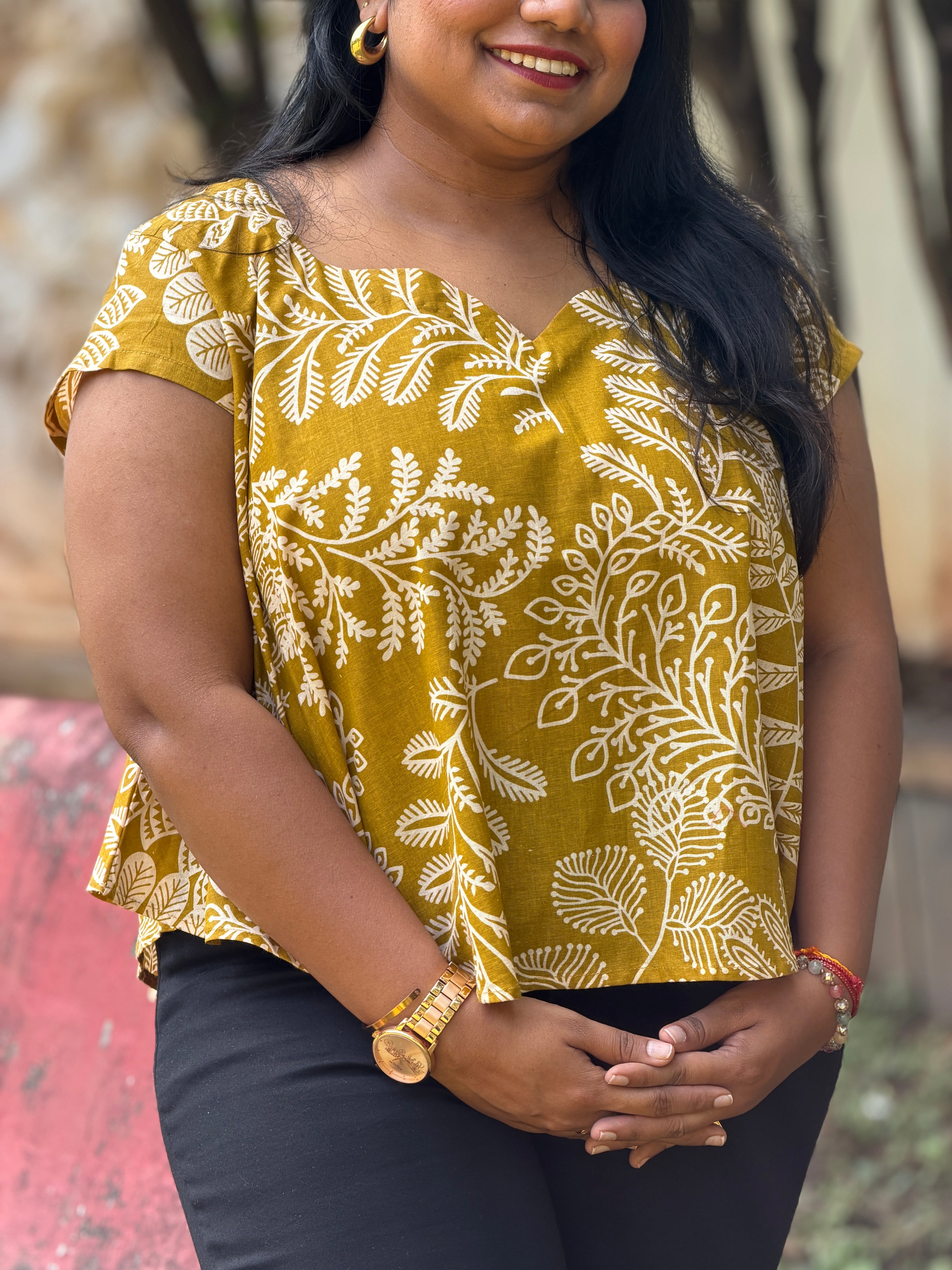 A soft cotton curvy V-neck top in muted mustard, detailed with white botanical prints. Light, flowy, and effortlessly calming — made to move gently with you.